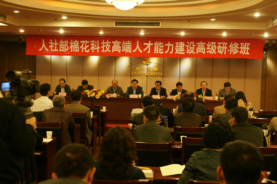 10月29-11月2日,由中国农业科学院棉花研究所承办的人力资源和社会保障部“棉花科技高端人才能力建设”高级研修班在河南安阳举办。 河南省人社厅党组成员、外国专家局局长郭成全,中共安阳市市委常委、市政府常务副市长朱明,棉花所所长、中国工程院院士喻树迅出席了开幕式并讲话。棉花所副所长侯志勇主持开幕式。全国棉花主产区省市、新疆生产建设兵团和国家棉花产业技术体系参加单位等45名管理、科研及技术推广人员参加了研修班。