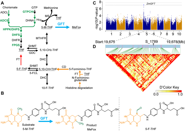 科研团队通过全基因组关联分析,发现编码玉米谷氨酸亚胺甲基转移酶基因是调控叶酸代谢的关键基因,其单碱基自然变异会导致蛋白序列中的一个氨基酸变化,如同一个“闸门”,调控有活性叶酸向无活性叶酸的转化量,从而显著影响玉米籽粒中活性叶酸的积累。敲除该基因后,玉米籽粒中活性叶酸含量显著提高。该研究结果不仅揭示了玉米谷氨酸亚胺甲基转移酶基因在植物叶酸代谢中的新分支途径,还提供了可直接利用的优良等位基因资源及其分子标记,为培育高叶酸功能性玉米提供了新的理论基础和应用思路。