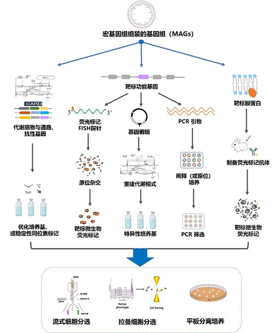 该综述归纳提出三种基于宏基因组数据分离和培养未培养微生物的方法。一是特定培养条件的设计。根据宏基因组数据提供的微生物代谢、底物利用、氧需求、抗生素耐药性等信息,结合平板稀释培养、稳定性同位素标记辅助拉曼活性微生物细胞分选等实现靶标微生物分离培养。二是特异性抗体捕获分离。预测靶标微生物基因编码的膜蛋白或抗原表位,合成抗原蛋白后制备特异性抗体并进行荧光标记,被标记的抗体与靶标微生物结合,利用荧光细胞分选技术分离被标记的靶标微生物。三是靶向功能基因筛选分离?;诎斜昊蛐蛄猩杓铺囟ㄒ锘蛱秸?,通过PCR或荧光原位杂交进行标记或筛选,利用细胞分选获得靶标细胞,结合相应的抗生素或底物培养基,实现靶标微生物的分离。