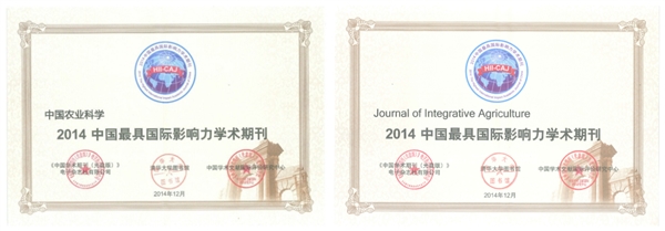 12月16日, 从“2014中国最具国际影响力学术期刊暨中国学术期刊国际、国内引证报告发布会”上获悉。由中国农业科学院主办、中国农科院农业信息研究所承办的《中国农业科学》和 《农业科学学报(Journal of Integrative Agriculture,JIA)》双双入选“中国最具国际影响力学术期刊”。此次是继2012年首次入选后,连续3年获此殊荣。