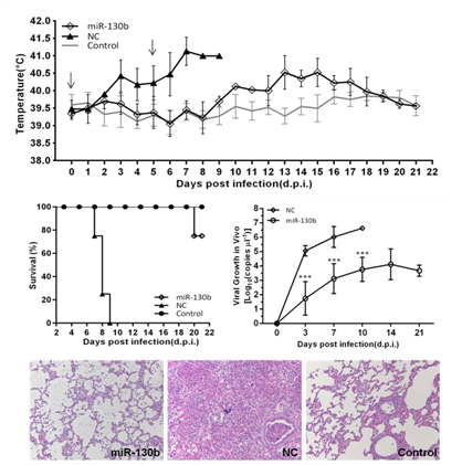 近年来,微小RNA被证明是一类可以调控病毒复制的分子,已有报道表明其是机体天然抗病毒的新防线,具备开发成小分子抗病毒药物的潜力。为了探索宿主微小RNA是否可以影响PRRSV,童光志研究团队通过生物信息学预测将目光聚焦到miR-130家族上。研究发现,miR-130家族可显著抑制北美型PRRSV在MARC-145细胞和PAM细胞上的复制,且尤以miR-130b的作用最为显著。更为可喜的是,动物体内试验证明对仔猪滴鼻给药miR-130b后再攻毒,可以显著地缓解高致病性蓝耳病的临床症状和病毒血症,同时形成部分保护的效果。