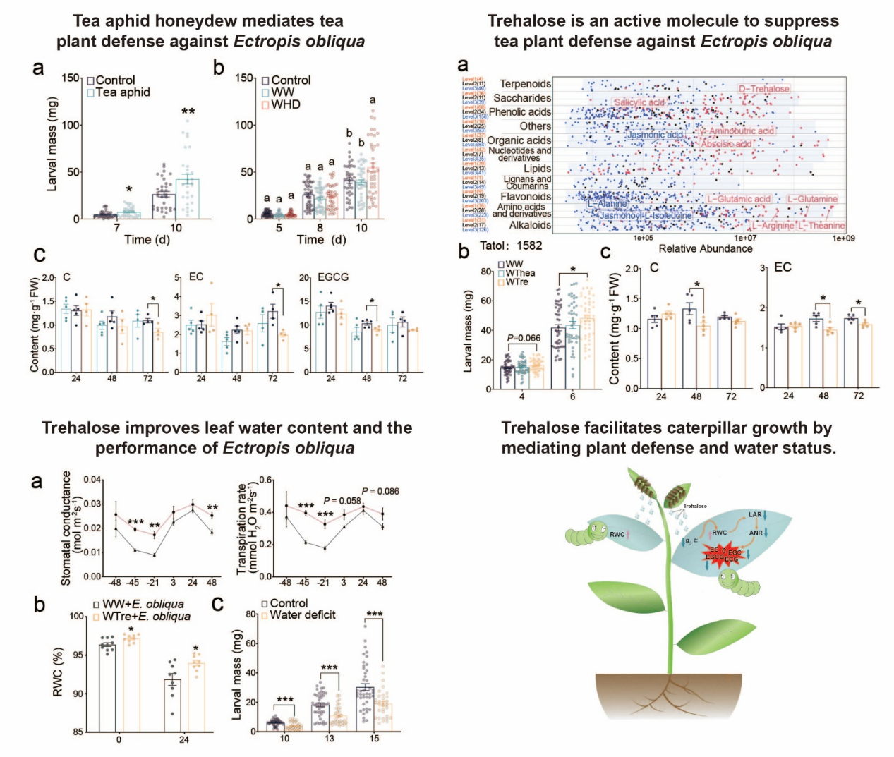 研究发现,茶蚜为害可促进后续茶尺蠖的生长,且茶蚜蜜露参与这一过程。茶蚜蜜露并非作为直接营养来源,而是通过抑制防御相关儿茶素的积累从而间接促进茶尺蠖的生长。科研人员通过对蜜露成分的系统分析和生测试验,鉴定出海藻糖为茶蚜蜜露中的活性分子之一,其通过双重机制显著增强后续取食的茶尺蠖的生长适合度。该研究不仅加深了对植物-昆虫互作机制的理解,也为培育抗虫茶树品种提供了新思路。