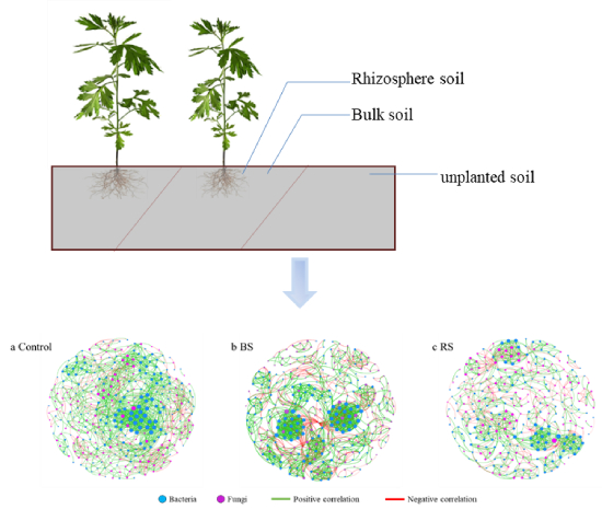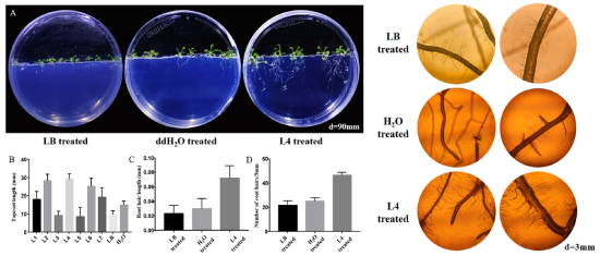 该研究通过对有七年黄花蒿种植历史的土壤取样,分析根际和非根际土壤细菌与真菌群落结构,发现鞘氨醇单胞菌与鞘脂菌两种植物促生细菌以及腐生性真菌在植物根际的富集?;苹ㄝ锔底樽暗奶厥馕⑸锿?,能够增强细菌与真菌的界间互作,以提升植物环境适应性。研究人员又进一步从黄花蒿根际土壤中成功分离11株植物促生功能菌株。其中,林可链霉菌菌株 Streptomyces lincolnensis L4定殖的植株,在主根长度与直径以及根毛数量等方面显著增加。同时,植物根系中多个根发育相关基因的表达分析确认了链霉菌菌株对于根发育的调节功能。