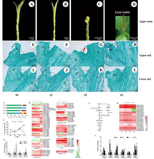 该研究运用解剖学、转录组学、生理学和分子生物学相结合的手段系统地研究了卷丹茎中、上部叶腋珠芽形成的机制。卷丹珠芽形成于地上茎与叶片连接的叶腋处,是由叶柄基部近轴端表皮下层的薄壁细胞分裂分化而来。根据解剖观察,取茎上部腋生珠芽形成不同阶段的叶腋组织及下部不形成珠芽的叶腋组织进行转录组测序和表达谱分析,研究发现淀粉和糖代谢及植物激素信号转导通路在珠芽形成中发挥了重要作用。淀粉的合成和积累可促进卷丹珠芽的启动。此外,激素在珠芽形成中表现出不同的调控模式。生长素促进珠芽的启动,但会抑制珠芽的进一步形成;细胞分裂素的高合成和低降解导致了卷丹上部叶腋珠芽的形成。相关结论通过生理学和分子生物学实验进一步得以验证。