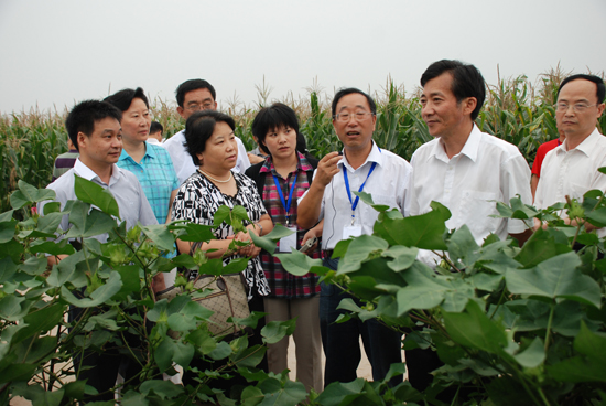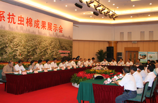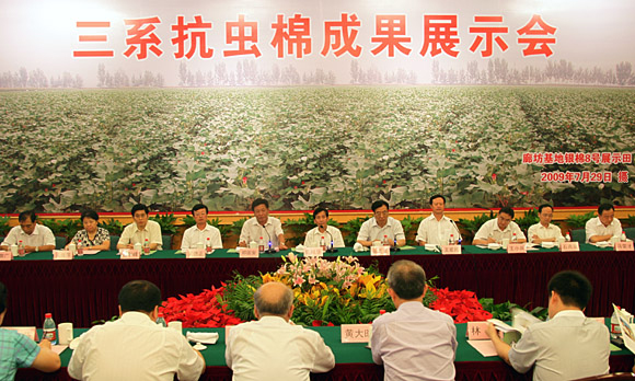 2009年8月25日下午,中国农业科学院(万庄)国际农业高新技术产业园区内彩旗飘扬,气球高悬,一派节日气象,三系抗虫棉成果展示会正在这里隆重召开。农业部陈晓华副部长、科技部郑国安秘书长、廊坊市人民政府王爱民市长、中国农业科学院翟虎渠院长以及科技部条财司领导,农业部办公厅、人事司、科教司、种植业司、计划司、财务司、科技发展中心、农技推广中心的领导,北京市农业局领导,廊坊市人民政府及廊坊市广阳区领导,中国农业科学院科技局和生物技术研究所领导及专家,来自山东、安徽、河南、四川、河北、山西和深圳等省市的18家育种单位和相关企业代表100人多参加了会议。
