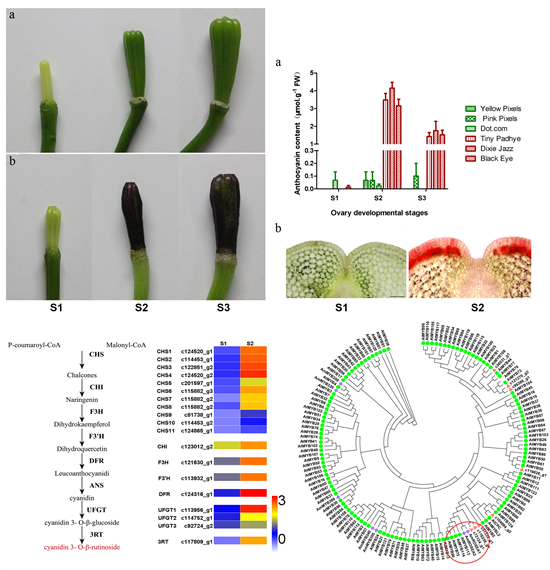 该研究运用解剖学、代谢组学、比较转录组学和分子生物学相结合的手段对百合紫色子房形成的分子机理进行了研究。紫色子房成色的色素主要成分为矢车菊素-3-芸香糖苷,且主要积累在子房壁表皮下第一层细胞。表达谱表明参与花青素苷合成通路的所有结构基因(除LhANS)在紫色子房中的协同共表达是紫色子房形成的关键机理。此外,该研究发现,控制百合花瓣中花青素苷合成的重要调控因子LhMYB12-Lat在调控子房花青素苷合成中也起到重要作用。