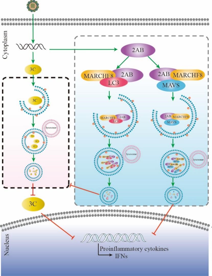 A型塞内病毒 (SVA)是一种新兴感染猪的病毒,在不同国家和地区暴发,成为一种全球流行的病毒。已有研究报道称A型塞内病毒感染可诱导自噬。然而,A型塞内病毒诱导自噬的分子机制及其对自噬的影响尚不清楚。团队研究发现,在A型塞内病毒感染早期宿主细胞激活自噬,通过自噬降解病毒3C蛋白以抑制A型塞内病毒复制。然而,在病毒感染后期,A型塞内病毒通过自身编码的2AB蛋白抑制自噬蛋白降解拮抗宿主对病毒的抑制作用。进一步研究发现A型塞内病毒 2AB蛋白泛素化LC3蛋白,并促进LC3蛋白降解,从而抑制自噬过程。此外,研究表明MARCHF8是IFN-I 信号转导的正调节因子。在病毒感染过程中,A型塞内病毒2AB蛋白靶向并降解MARCHF8 和MAVS形成的复合体,抑制IFN-I信号通路。该研究不仅系统阐明了A型塞内病毒抑制自噬和IFN-I信号通路促进病毒增殖的分子机制,同时为抗病毒药物的研制和疫苗的开发提供理论基础。