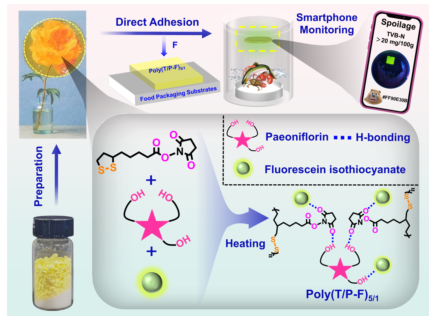 目前,开发能够安全附着于多种包装表面,并在高湿度条件下保持稳定性的智能监测系统仍面临挑战。该研究使用硫辛酸修饰物与荧光分子伴侣相结合,通过简便的一步热压策略设计出一种具有自粘附性、环境耐受性且对生物胺响应的荧光传感器。这种独特设计的分子结构使传感器无需额外粘合剂即可牢固附着于各类包装基材。更值得关注的是,该荧光传感器在恶劣储存环境(如高湿度等)下仍保持良好粘附性与稳定传感性能。该材料对腐败诱导的生物胺展现出卓越的荧光响应特性,而芍药苷的引入显著提升了其敏感度。科研人员通过实验与分子轨道理论计算揭示了荧光增强机制,并将荧光传感器成功应用于虾、鱼、牛肉和猪肉的新鲜度分级监测。该研究为高蛋白食品的原位可视化监测提供了新策略。