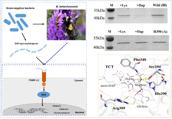病虫害威胁和营养缺失是影响熊蜂人工繁育的重要因素。肽聚糖识别蛋白是熊蜂参与抗菌免疫和肠道菌群调节的关键模式识别受体,在熊蜂抵抗病虫害及维持肠道健康方面发挥着重要作用。该研究发现兰州熊蜂肽聚糖识别蛋白通过识别Dap型肽聚糖,激活下游信号通路启动先天免疫应答机制,进而清除病原微生物和调节肠道微生物。而且发现在肽聚糖结合槽内390位的组氨酸是兰州熊蜂结合Dap型肽聚糖的锚定残基,而模式生物果蝇结合Dap型肽聚糖的锚定残基是413位的精氨酸。因此,我们推测膜翅目蜂类肽聚糖识别蛋白结合Dap型肽聚糖的机制和双翅目果蝇不同。