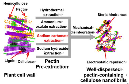 该研究针对苎麻纤维,采用一系列果胶预提取方法,制备具有不同果胶成分和含量的纤维素纳米纤维,研究果胶对纤维素纳米纤维综合性能的影响规律。根据研究结果,研究人员发现了果胶对植物细胞壁解离及其纳米纤维素再分散的作用机制,揭示了果胶、半纤维素或木质素、纤维素多层级复合纳米结构的形成,以及基于该结构产生的表面静电排斥效用和空间位阻效应。在纳米纤维素利用领域,防止高浓度或干态纳米纤维素的团聚一直是最具挑战性的问题之一,而果胶刚好可以起到分散纳米粒子的作用。