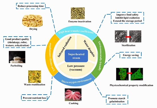 文章系统阐述了过热蒸汽加工的基本原理和应用场景,总结出过热蒸汽比传统的热处理方法具有更高的传热系数,可以有效消除或减少食品表面的微生物,抑制脂质氧化和有害化合物生成;且过热蒸汽能够改善蛋白质与其他分子的互作、适当的淀粉糊化,还可以减少营养损失,改善食品的理化性质。对过热蒸汽加工中食品品质的形成与调控进行深入研究,将有效控制过热蒸汽过度加工导致的产品质量劣变。
