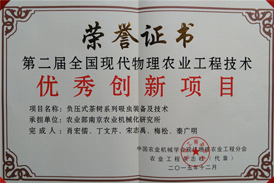 南京农业机械化研究所获悉,该所研发的“负压式茶树系列吸虫”装备及技术获得中国农业机械学会颁发的全国现代物理农业工程技术优秀创新项目奖。