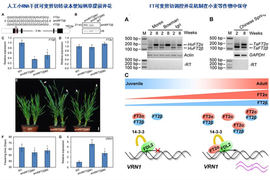 该团队研究发现在短柄草生长早期,FT2成花素基因通过可变剪切方式编码一个干扰型蛋白,阻止正??ǖ鞍赘春咸宸⒒幼饔茫坏倍瘫萁肟ㄆ谑?,功能型蛋白的转录本表达开始加速,超过干扰蛋白转录本的表达量,从而保证短柄草正???。该机制在小麦、大麦等早熟禾亚科作物中具有保守性,是调控此类作物开花的重要机制。此研究对麦类等相关作物抽穗期的调控研究具有重要意义。这一工作是该团队通过大量小分子RNA生物信息数据挖掘,继前期发现一个微RNA(miR5200)通过切割成花素基因FT1影响短柄草开花机理的基础上,在作物开花时间调控的分子机制研究方面的又一重要进展。