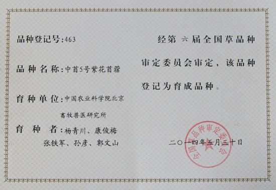 北京畜牧兽医研究所杨青川研究员率领的科研团队历时10多年育成的耐盐高产紫花苜蓿新品种—“中苜5号”通过了全国草品种审定委员会审定。该品种的育成对充分利用我国北方地区特别是黄淮海地区盐渍化土地发展优质饲草种植,促进我国节粮畜牧业发展和促进农牧民增收具有重要意义。