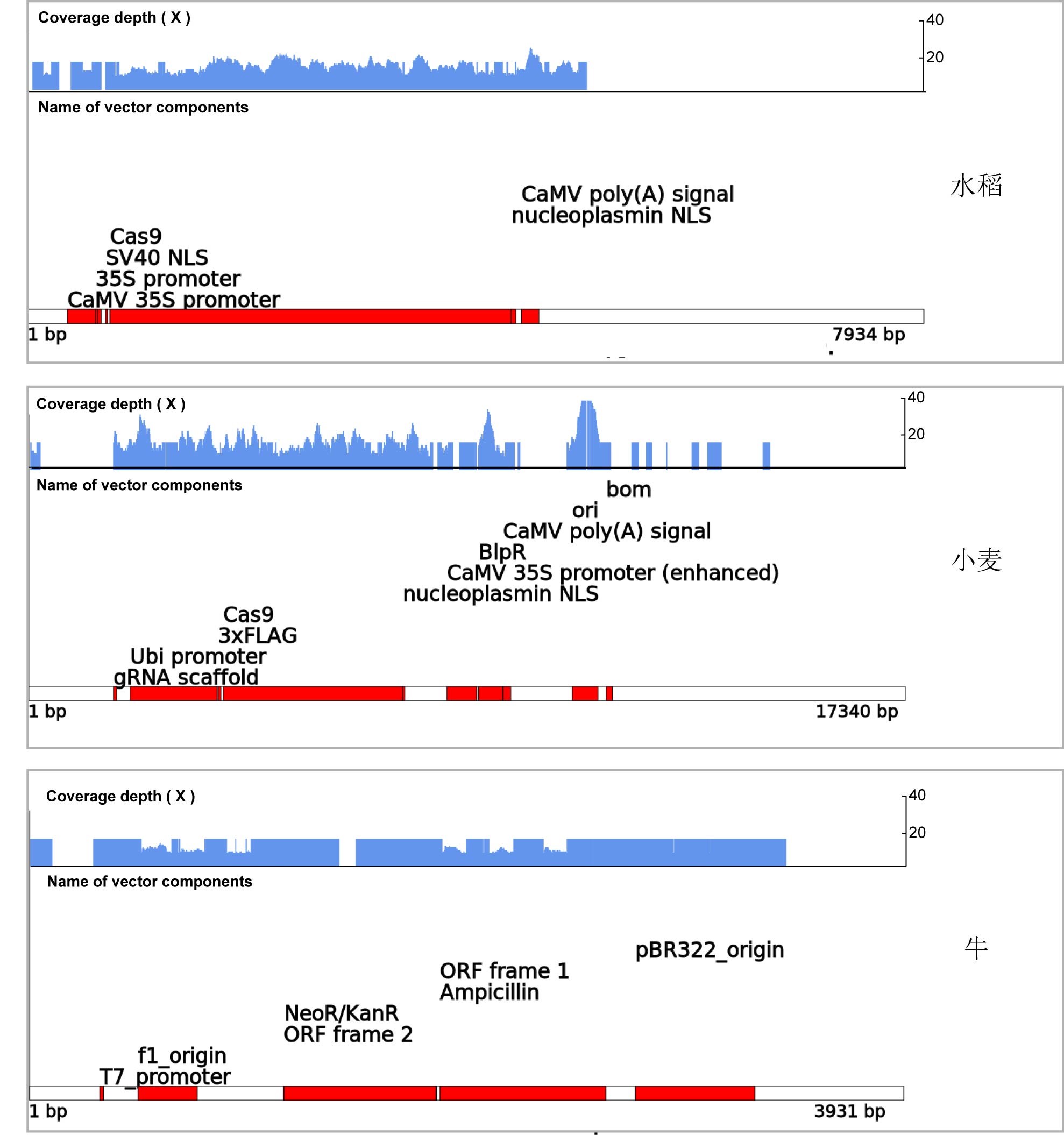 不同于传统的PCR检测,FED对全基因组重测序数据进行分析,可在外源成分信息未知的情况下,一次性完成对46695种不同外源成分序列的检测,同时FED还可以鉴定出外源成分的片段长度及在基因组上的精确插入位置。目前,FED已经内置了24种植物(水稻、小麦、玉米、大豆、油菜、西红柿等)和13种动物(猪、牛、羊、鸡、鸭等)的参考基因组信息,有望为全球基因组编辑生物的应用和安全监管提供重要工具平台。