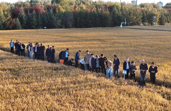 与会人员深入大兴农场第四、第九管理区以及七星农场第一管理区36队的试验田进行实地考察??翁庵鞒秩诵煨屡笱芯吭痹谔锛涞赝方辛讼殖〔獠徒步?,重点展示了“智能化推荐施肥提升水稻单产”技术的集成应用效果。两个测产点均成效显著:水稻单产分别达到1574斤和1553斤,增产6%至10%。养分专家系统智能推荐、机插秧侧深施肥、秸秆还田与新型肥料等技术的精准组合,在减少施肥量、节约生产成本的同时,实现了产量与效益的协同增长,为黑土地?;び胫种不г鍪仗峁┝丝筛粗?、可推广的现代化解决方案。