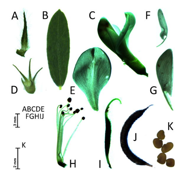 (A:托叶。B:小叶。C:花。D:花萼。E:旗瓣。F:翼瓣。G:龙骨瓣。H:雄蕊。I:子房。J:荚果。K:种子。中国农科院供图)