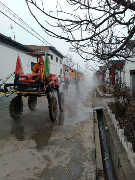 陕西省宝鸡市千阳县鑫民农机合作社在当地村镇进行消毒防疫。(国家自走式植保机械科技创新联盟提供)