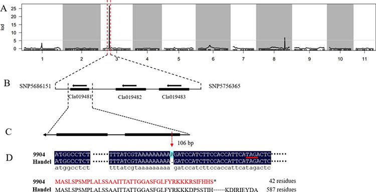 据介绍,该团队利用杂交分离群体成功定位到控制这3个性状的基因。研究结果发现西瓜果皮颜色由单基因控制,深绿对浅绿为显性,该基因位于8号染色体上;控制西瓜种皮颜色的基因是3号染色体上一个编码多酚氧化酶蛋白的基因,黑色种皮相对于浅黄色种皮为显性;控制节间长短的基因是位于9号染色体上的一个编码赤霉素3β-羟化酶蛋白的基因。