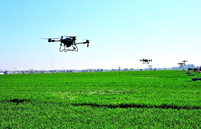 商丘市夏邑县桑堌乡植保无人机喷施蛋白营养液。张壮伟摄/光明图片