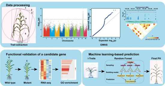研究人员进一步利用早期性状构建机器学习模型来预测玉米最终的株高,发现仅需5个图像性状就可在早期发育阶段对最终株高进行预测,预示着这些性状可作为潜在的株高发育相关生物标记,对玉米株型改良和遗传育种具有重要的应用价值。该研究深入解析了玉米株高形成的动态遗传基础和调控网络,拓展了人们对株型发育机制的理解,为玉米精准表型鉴定、基因资源挖掘、表型预测及遗传改良提供了重要的数据支撑和基因资源。
